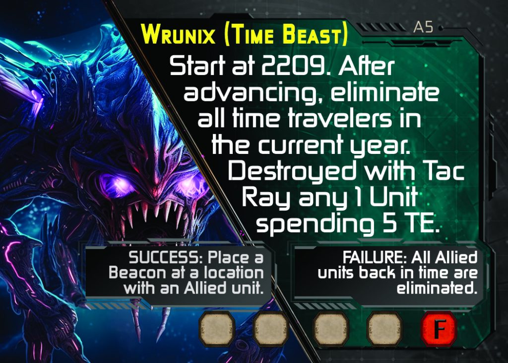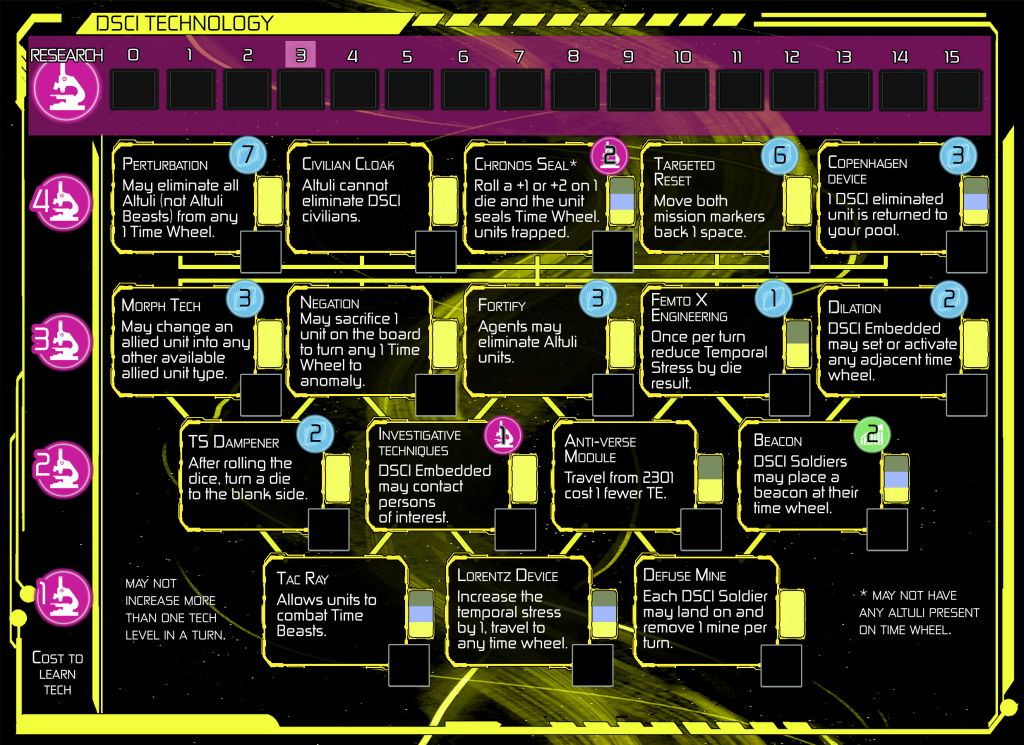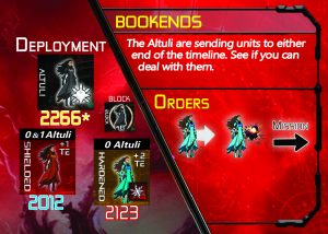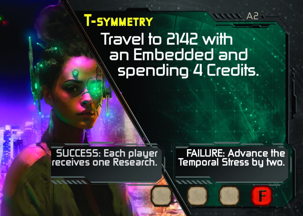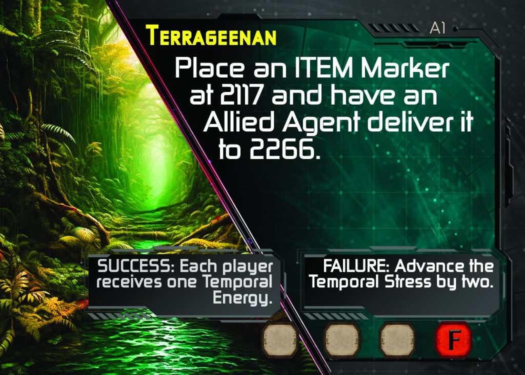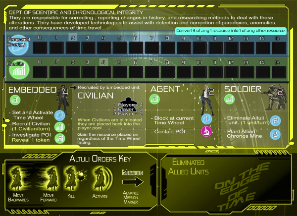 This is a cooperative/solo game. The year is 2301 and scientists have uncovered the occurrence of a number of causal loops. Through additional investigation, it is discovered that the Altuli have developed time travel, and have begun to change the time stream. Some changes have created these causal loops. You and up to two other factions will need to send Embedded, Agents, and Soldiers back into the last 300 years to try to straighten things out. The wheels of time intersect at key moments, and the actions you take might have unintended consequences in the future. Each anomaly generated increases the temporal stress. Excessive stress might mean the end of all things. Missions are assigned based on the discoveries of our researchers. If too many assignments are not dealt with successfully, it may be too late to stop the Altuli and save the timeline. Victory lies in changing the past so that we can mitigate the damage while improving our technology to the point where we can lock the time stream.