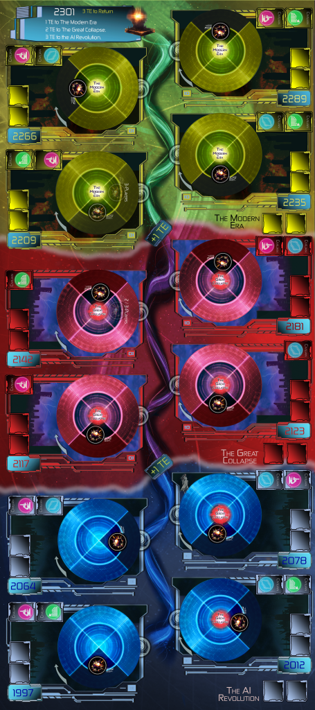You and up to two other factions will need to send Agents, Soldiers, and Embedded back through the last 300 years to try to straighten things out. The wheels of time intersect at key moments, and the actions you take might have unintended consequences in the future. Each paradox generated increases the temporal stress, and too much temporal stress might mean the end of all things.